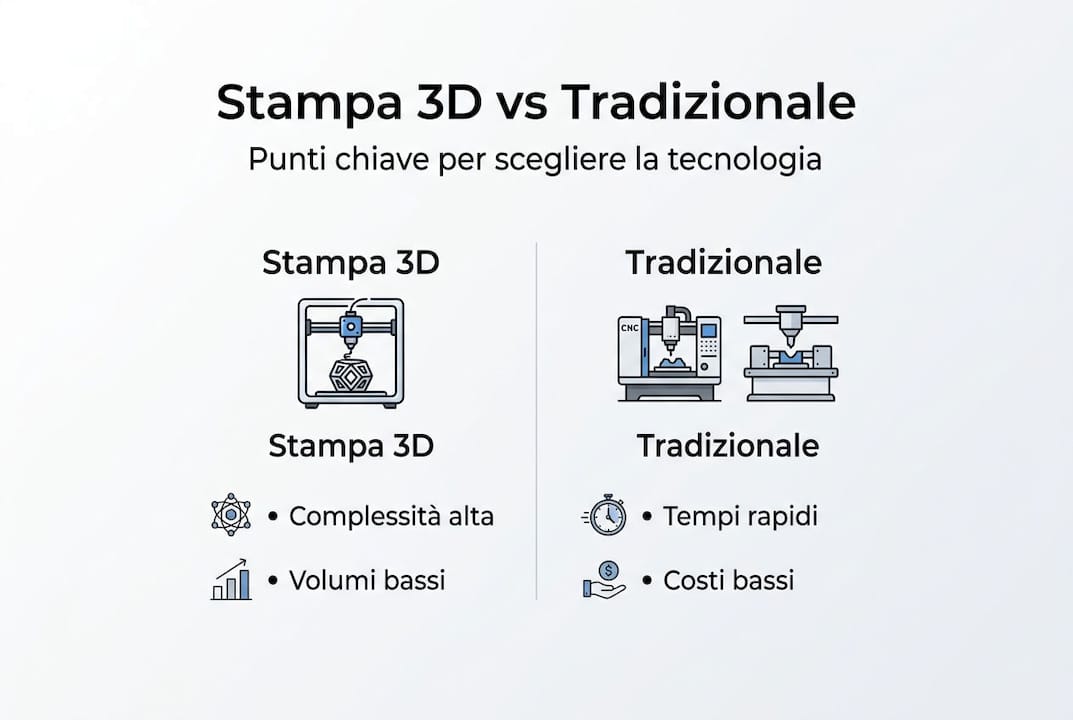 Compresi i passaggi fondamentali del processo, conviene capire quale tecnologia sia realmente più adatta per ogni esigenza. La stampa 3D non è sempre la risposta giusta, e scegliere male costa tempo e denaro.