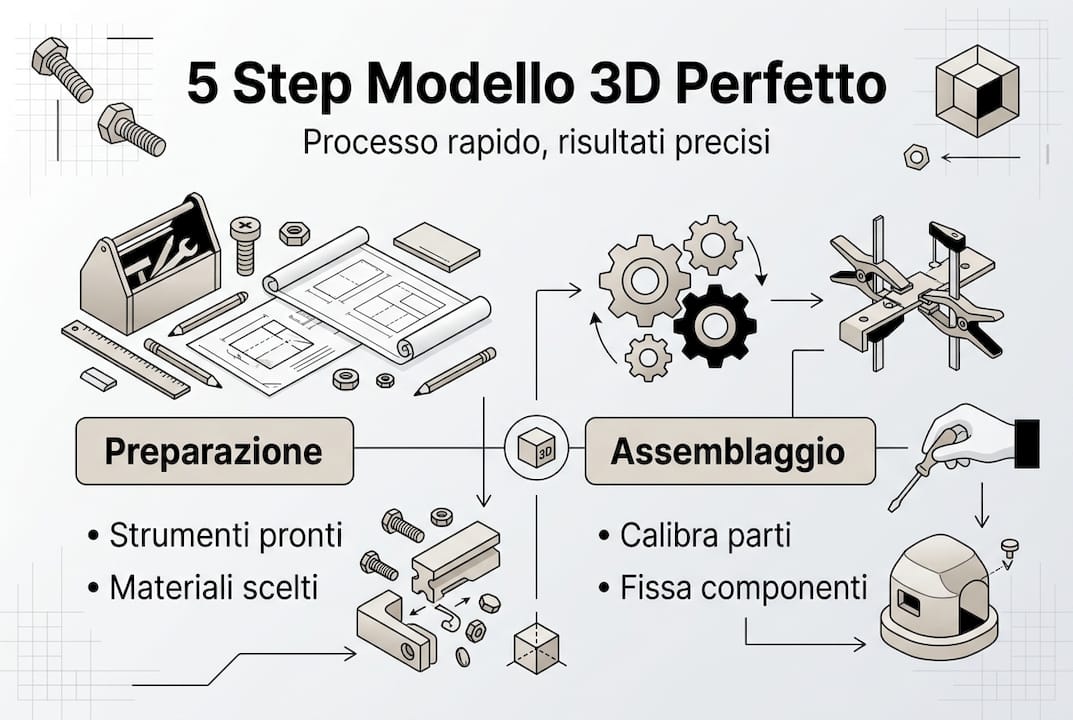 Hai appena terminato ore di stampa, i componenti sono pronti sul banco, ma al momento dell'assemblaggio qualcosa non torna: un incastro troppo stretto, un foro fuori tolleranza, una superficie che non combacia. È una delle frustrazioni più comuni tra maker e professionisti della stampa 3D. Non dipende dalla stampante, né dal materiale. Dipende dal metodo. Questa guida ti accompagna passo dopo passo attraverso l'intero processo, dalla preparazione dei file fino alla finitura finale, con indicazioni pratiche testate sul campo per ottenere assemblaggi precisi, robusti e replicabili, sia nei prototipi che nelle produzioni su misura.