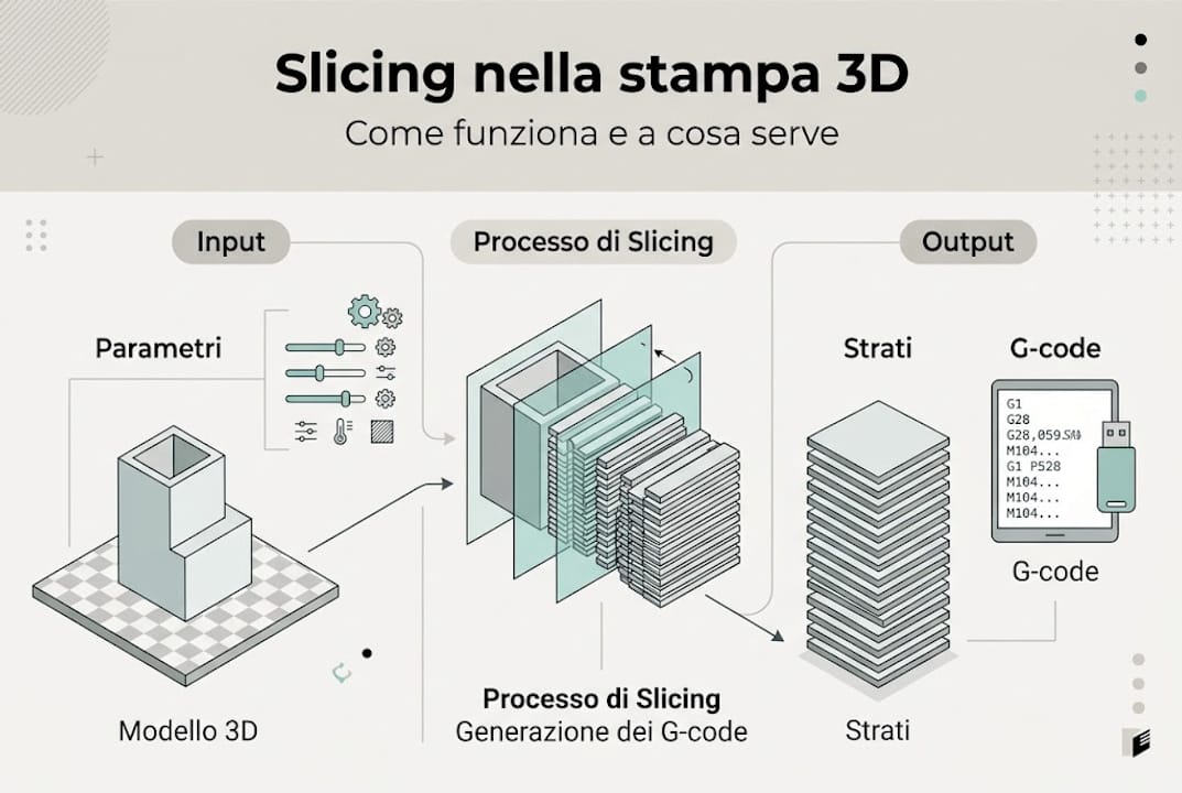 Molti imprenditori e progettisti confondono lo slicing con la modellazione 3D o con la configurazione della stampante, trattandolo come un dettaglio secondario. È un errore costoso. Lo slicing è il passaggio che trasforma un file digitale in istruzioni reali per la macchina, determinando qualità superficiale, resistenza meccanica, consumo di materiale e tempi di produzione. Capire come funziona davvero, quali parametri modificare e come affrontare modelli complessi significa avere un controllo concreto sul risultato finale. Questa guida risponde a tutte le domande fondamentali, con esempi pratici e indicazioni operative per chi vuole fare della stampa 3D un vantaggio competitivo reale.