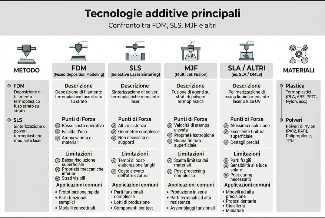 | Tecnologie a confronto | FDM è versatile e veloce, SLS e MJF garantiscono proprietà meccaniche superiori e isotropia nei pezzi critici. |